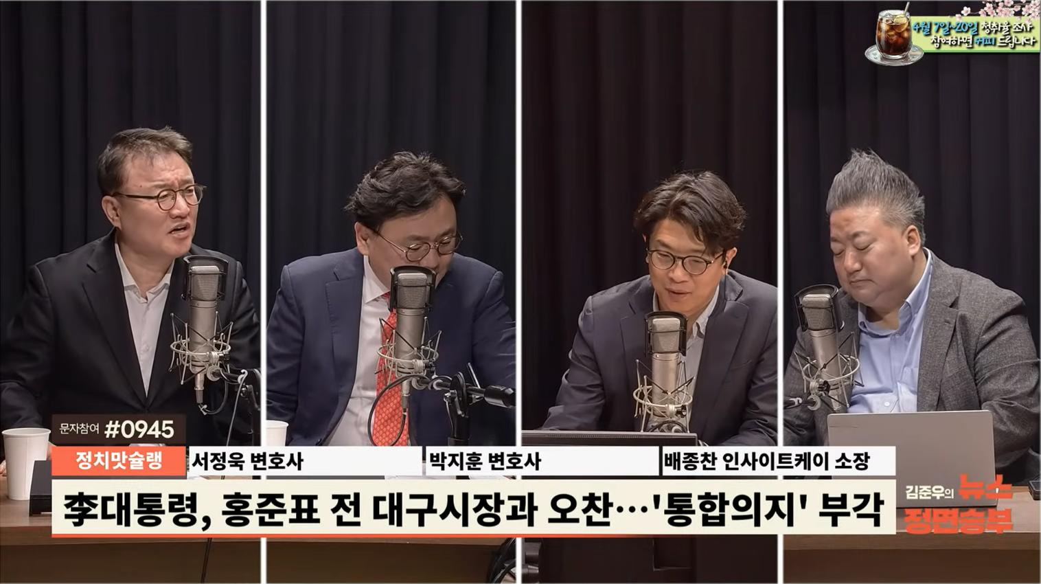 ☆ 서정욱 : 저는 이재명 대통령이 TK상륙 작전을 편다. 그게 김부겸과 홍준표다. 둘을 이용해서 TK상륙작전을 하는데 개인적으로는 홍준표 시장이 뭐랬습니까? 붉게지는 석양의 아름다움처럼...이런 말을 했어요. 이게 붉게지는 석양의 아름다움이 아니고 정말 노욕, 노추 그리고 배신 행위다. 이렇게 저는 봅니다. 이러려고 국민의힘 탈당하고 김부겸 지지하고 결국에 좌파 쪽으로 투항한 거 아닙니까? 저는 총리 가능성이 높다고 보거든요. 나중에 그 지방선거 후에 김민석 당대표 하면 가능성이 있다고 보는데 정말 우리 보수로서는 진짜 이렇게 크게 배신하고 떠난 거다. 보수에서 그만큼 이게 국회의원도 한 네 번 했나요? 도지사 두 번에 시장 한 번에 당대표 두 번에 대선 주자까지 하신 분이 이렇게 보수를 철저하게 짓밟고 떠나는 게 너무 이렇게 저는 참 이렇게 분노가 들어요.