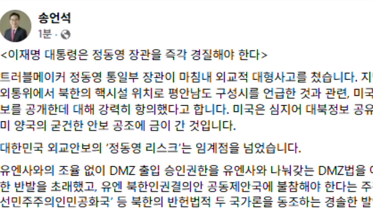 송 원내대표는 어제(18일) SNS에 미국이 민감한 북한 기밀정보를 공개한 데 대해 강력히 항의하고 대북정보 공유까지 제한하기로 했다고 한다며, 대한민국 외교·안보의 '정동영 리스크'가 임계점을 넘었다고 지적했습니다.