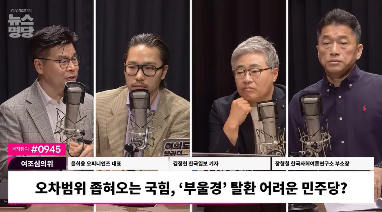 ◆ 장성철: 장성철의 뉴스명당 화요일 4부에서는 여론과 민심의 흐름을 세세하게 읽어보는 시간입니다. 많은 분들이 이 시간 기다린다고 저한테 얘기하더라고요. 여론조사심의위원회 윤희웅 오피니언즈 대표님 어서 오세요.