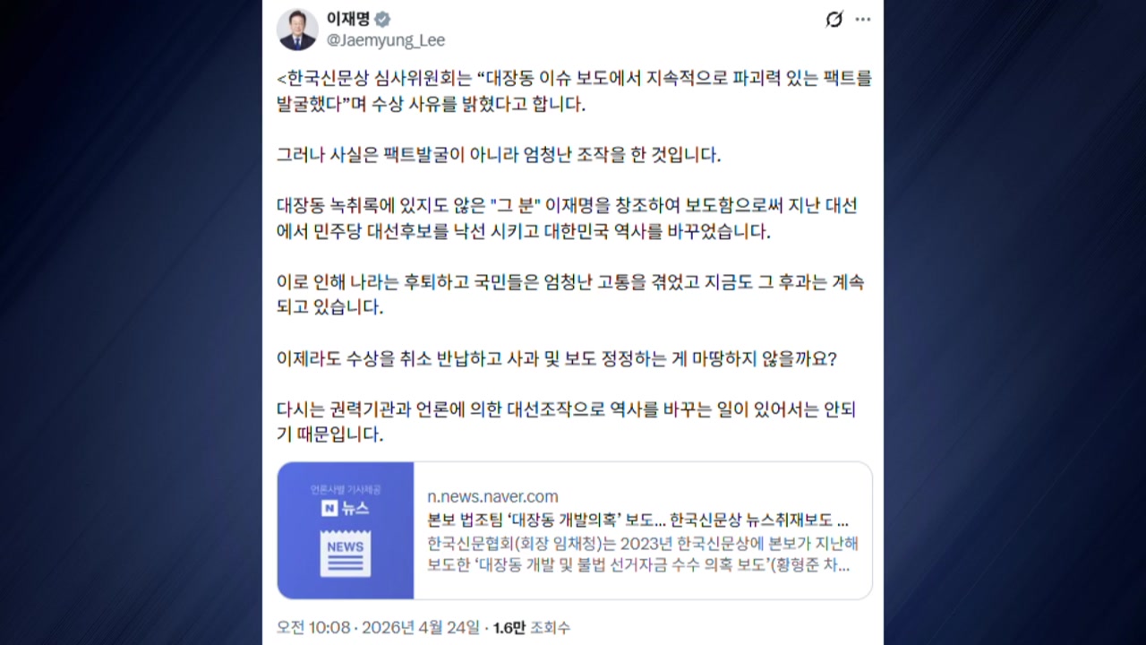 이 대통령은 오늘(24일) SNS에, 대장동 녹취록에 있지도 않은 '그분' 이재명을 창조해 보도함으로써 지난 대선에서 민주당 대선후보를 낙선시켰다며 이같이 적었습니다.