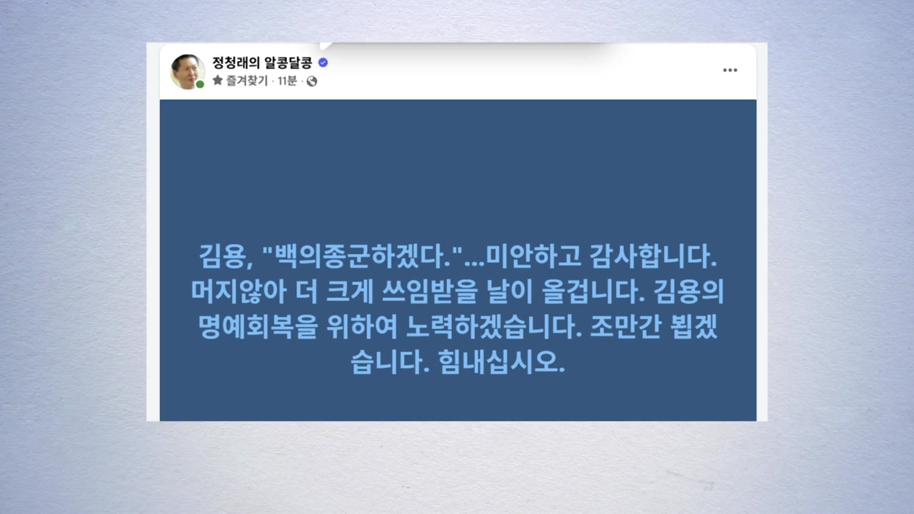 정 대표는 어제(28일) SNS에, 백의종군하겠다고 밝힌 김 전 부원장에게 미안하고 감사하다며 이같이 밝혔습니다.