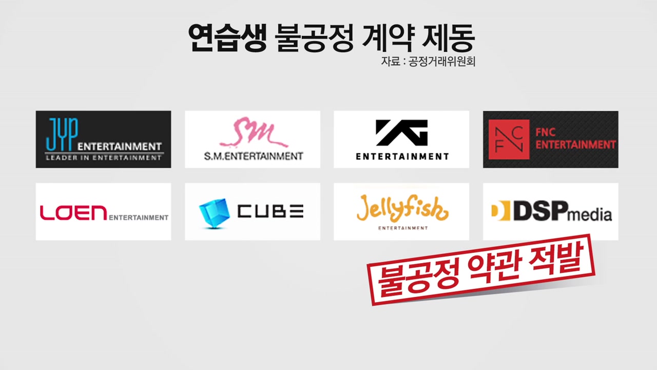 JYP, SM, YG 등 국내 대형 연예 기획사 8곳이 연습생을 뽑으면서 노예 계약이나 다름없는 불공정 약관을 적용하다 적발됐습니다.