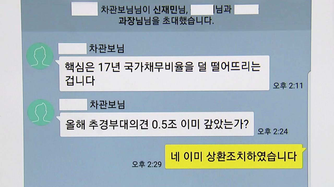 신 전 사무관이 공개한 채팅 화면에는 "핵심은 2017년 국가채무비율을 덜 떨어뜨리는 것"이라는 차관보의 지시 내용 등이 담겨 있습니다.
