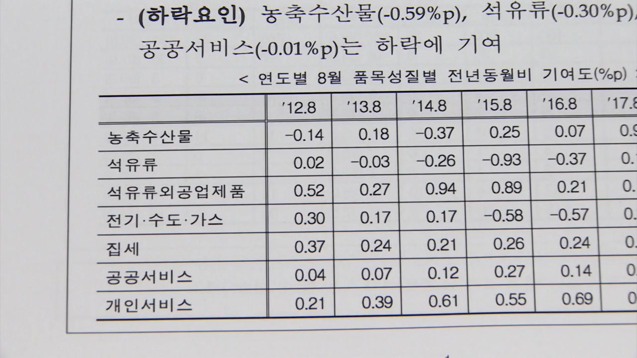 2015년을 100으로 기준 잡고 산출하는 '소비자물가 지수'로 비교하면 지난달이 104.85였고, 지난해 8월이 104.81이어서, 지수 상으로도 0.04 마이너스가 성립됩니다.