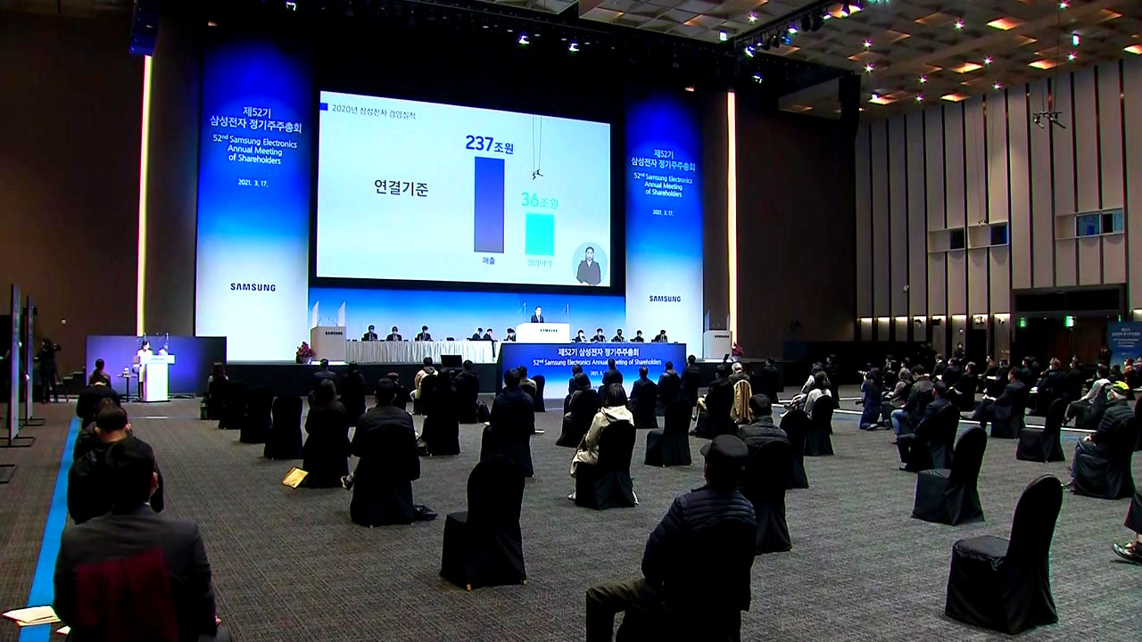 삼성전자의 정기 주주총회가 온라인과 오프라인으로 동시에 열렸습니다.