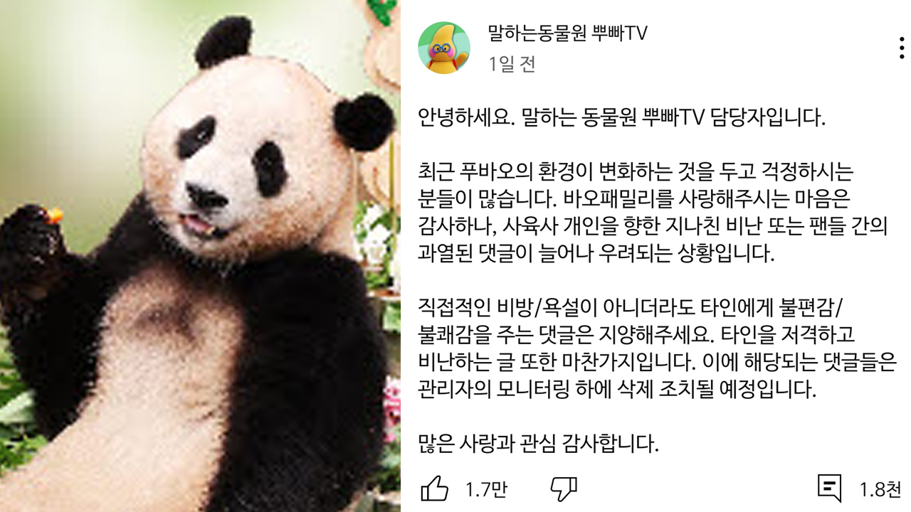 에버랜드 유튜브 채널 '뿌빠TV' 측은 입장문을 통해 바오 가족을 사랑해주는 마음은 감사하지만, 사육사 개인을 향한 지나친 비난 또는 팬들 간의 과열된 댓글이 늘어나 우려되는 상황이라며 이같이 밝혔습니다.