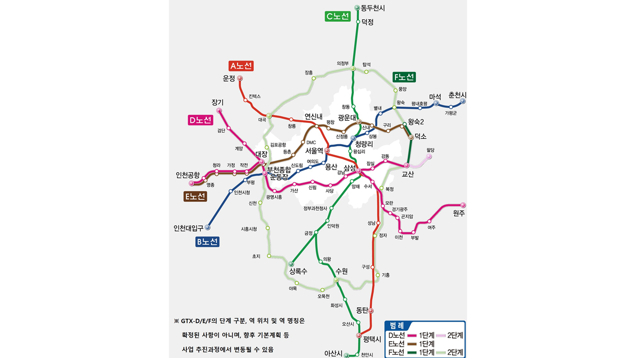국토교통부는 GTX-D, E, F 구간을 1, 2단계로 나눠 1단계는 2035년 개통을 목표로 현 정부 임기 내 예비타당성 통과를 추진합니다.