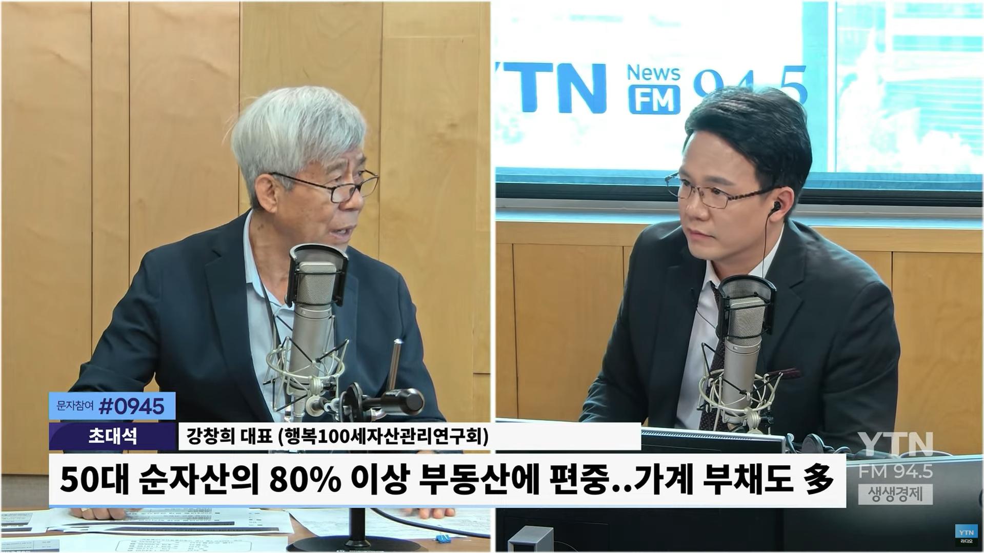 ◇ 강창희 : 네 제 생각인데요. 예를 들어서 조기 퇴직이죠. 그러니까는 50대 초반에 퇴직해 가지고, 적어도 한 40년 정도는 뭘 하고 살까. 노후의 3대 불안이 돈 건강 외로움이거든요. 3대 불안을 해소하는 최선의 방법이 사실은 일이 있어야 돼요. 뭐하고 사는가가 중요하고 그다음에 요즘은 자녀를 늦게 낳기도 하고, 또 자녀들이 자립을 늦게 하잖아요. 또 현재 예를 들어서 성인이 돼 가지고 생활비를 부모한테 의존하는 캥거루가 우리나라에 313만 명이 있다는 거거든요. 소위 자녀 리스크 또 큰 걱정이고요. 그다음에 세 번째가 뭐냐 하면 가외 자산의 구조조정 문제인데, 재산이 50대 가구의 평균 순자산의 84%가 부동산이거든요. 그러면 집 한 채 밖에 금융 자산이 없으니까, 아니 퇴직하고 나서 이번에는 화장실 팔아 서고 다음 달에 건너방 팔아 서고 이럴 수도 없는 거 아니에요. 부동산에 편중된 자산 구조가 첫째 문제고, 두 번째는 가계 부채가 많아요. 저축액 부채의 비율을 보면 일본 같은 경우에는 20-30대는 한 190% 정도 되거든요. 퇴직할 때가 되면 그 비율이 5% 정도로 줄어들어요. 근데 우리도 30대에 한 100% 넘는데, 퇴직하고 나서도 50% 가까이 돼요. 가계부채가 50대 가구의 평균이 1억 300이라고 그러거든요. 그러니까 갚지 못한 부채하고, 있는 재산이 부동산밖에 없는 거, 금융자산이 없는 거 세 가지가 큰 문제죠.