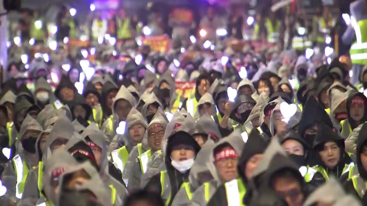 비가 내리는 가운데 이들은 우비를 입고 집회에 참여했습니다.