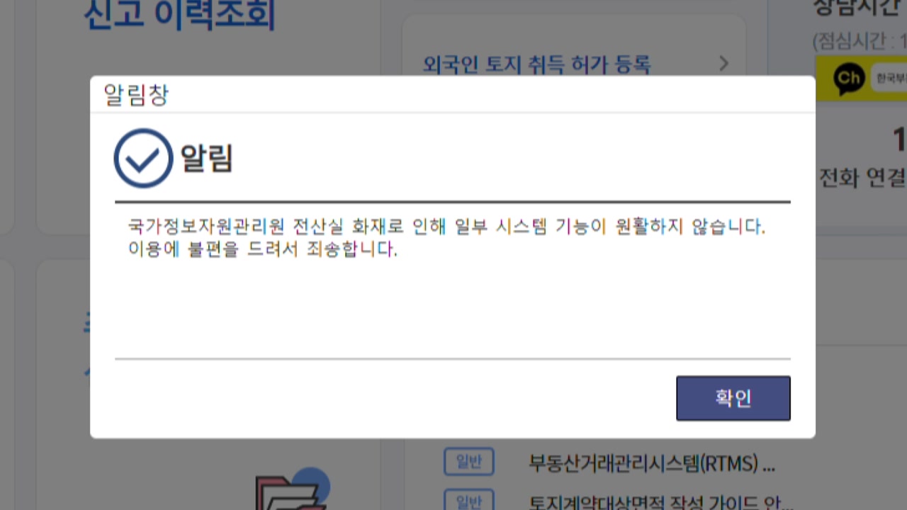 국가정보자원관리원 화재 여파로 온라인 부동산 거래 신고와 거래에 필요한 서류 발급이 중단되는 상황이 이어지고 있습니다.