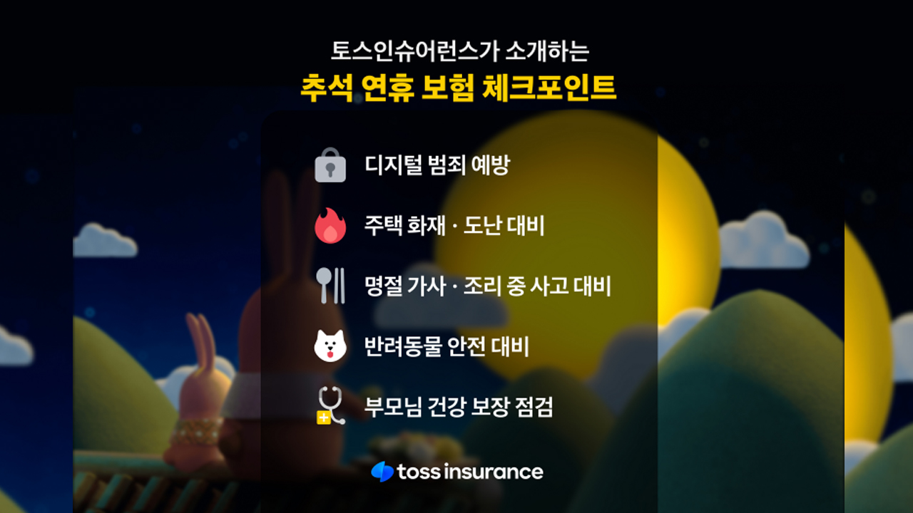 법인보험대리점 토스인슈어런스가 추석 연휴 예상치 못한 사고나 위험에 대비하는 데 도움이 될만한 '보험 체크포인트' 5가지를 소개했습니다.