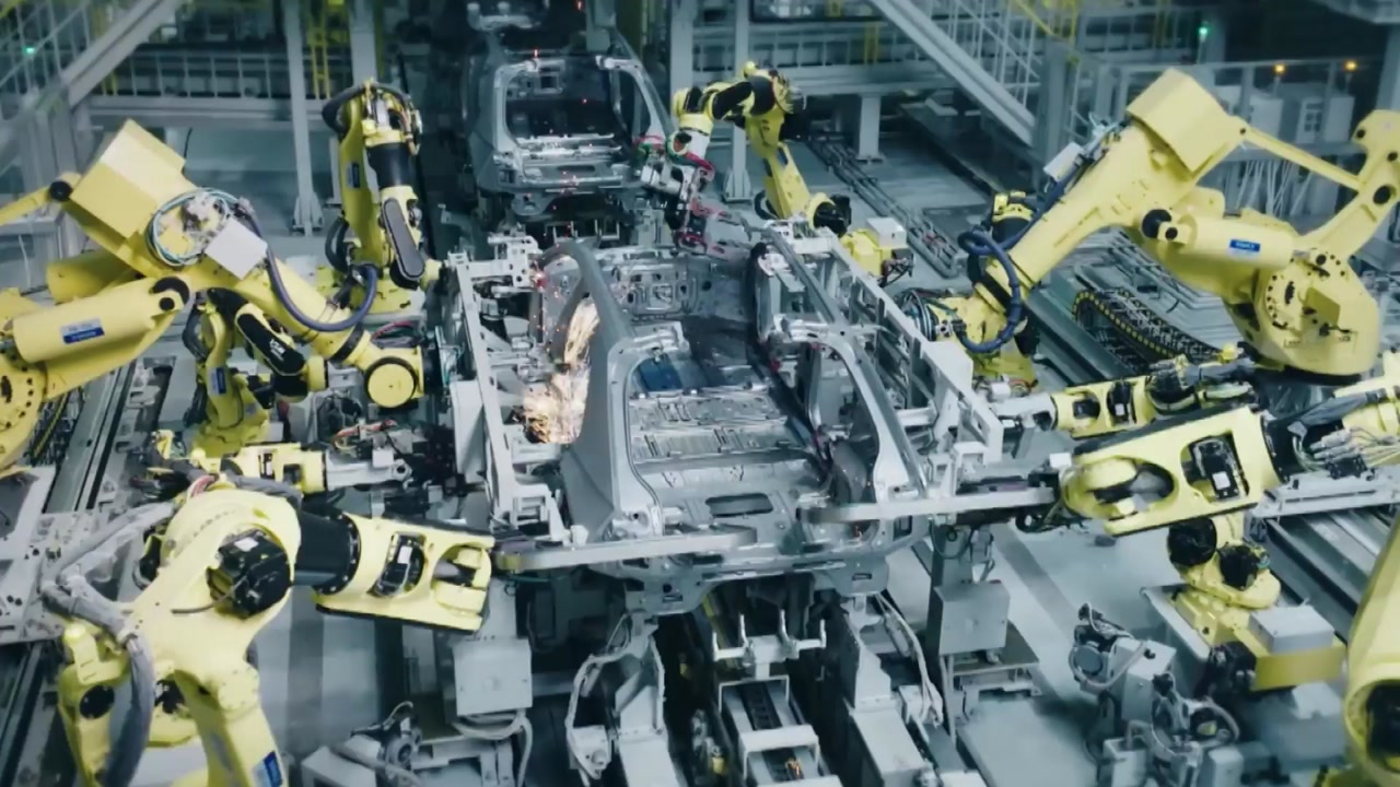 각종 로봇이 쉴 새 없이 움직이며 용접과 조립, 운반, 검사 등을 담당합니다.