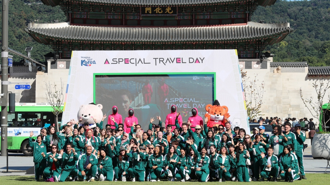 한국관광공사가 광화문광장에 외국인 관광객을 초청해 '오징어 게임 핑크가드와 함께하는 K-게임 데이'를 개최했다고 밝혔습니다.