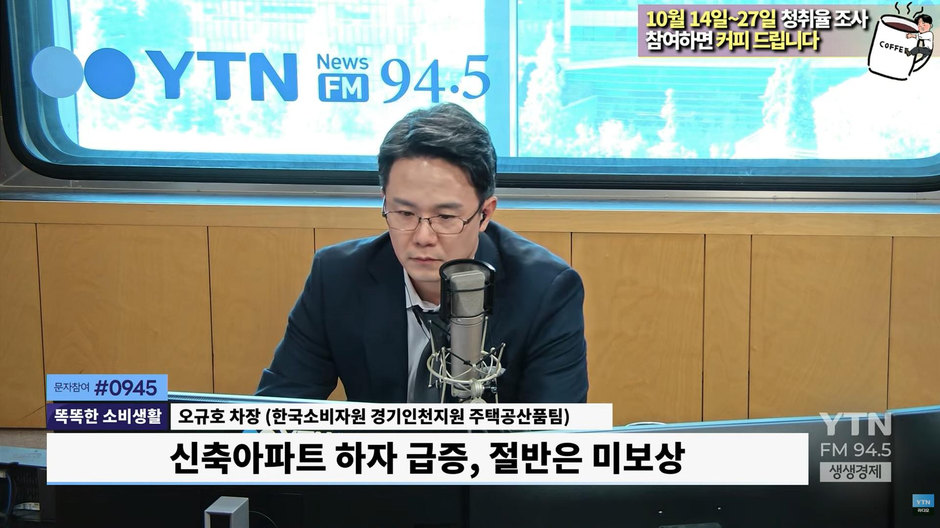◆ 조태현 : 똑똑하고 현명한 소비자로 거듭날 수 있는 유용한 정보들 전해드리는 <똑똑한 소비생활> 시간입니다. 요즘 최신식 설비와 쾌적한 주거 환경을 선호하여 신축아파트를 분양받는 소비자가 많습니다. 그런데 최근 건축 원가가 상승하고 자재 수급이 불안정한 탓인지, 신축아파트의 시공 품질이나 하자보수에 대한 소비자의 불만이 늘고 있다고 합니다. 관련 내용, 한국소비자원 경기인천지원 주택공산품팀 오규호 차장과 이야기 나눠보겠습니다. 차장님 안녕하세요?