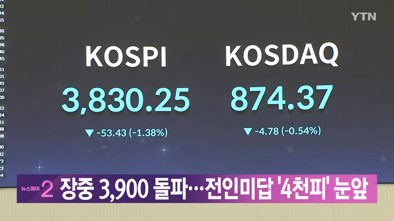 ■ 코스피가 사상 처음으로 장중 3,900선을 뚫었습니다. 3,800을 넘은 지 불과 사흘 만인데요. 전인미답 '사천피' 돌파도 코앞에 두고 있습니다.