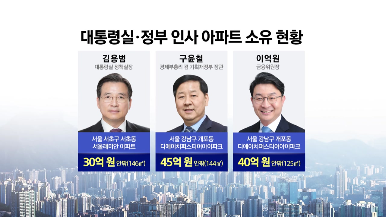 이 외에도 부동산 대책을 주도하고 있는 정부 고위 인사들의 고가 아파트 보유 경위가 논란이 되고 있습니다.