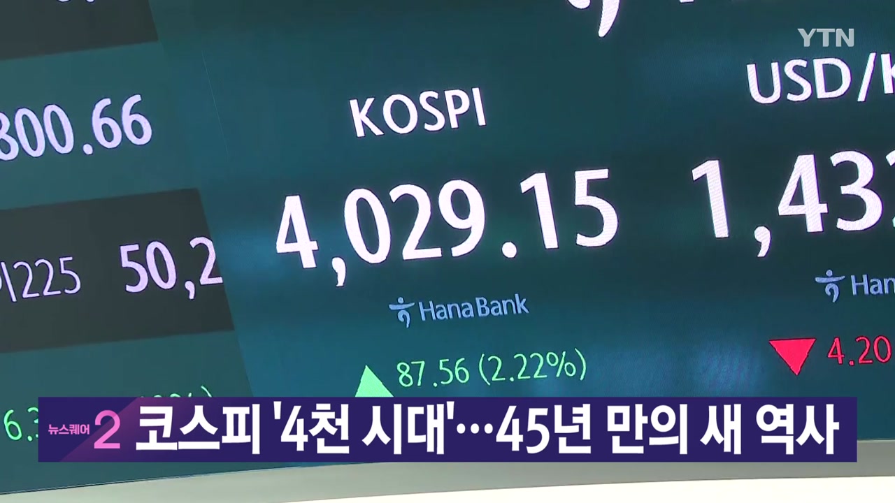 ■ 코스피가 사상 첫 장중 4,000선을 돌파하며 한국 자본 시장의 새 역사를 썼습니다. 미중 무역협상 타결 기대감 속에 시총 1위인 삼성전자가 첫 10만 전자를 기록하고, SK 하이닉스는 53만 원대를 기록했습니다.