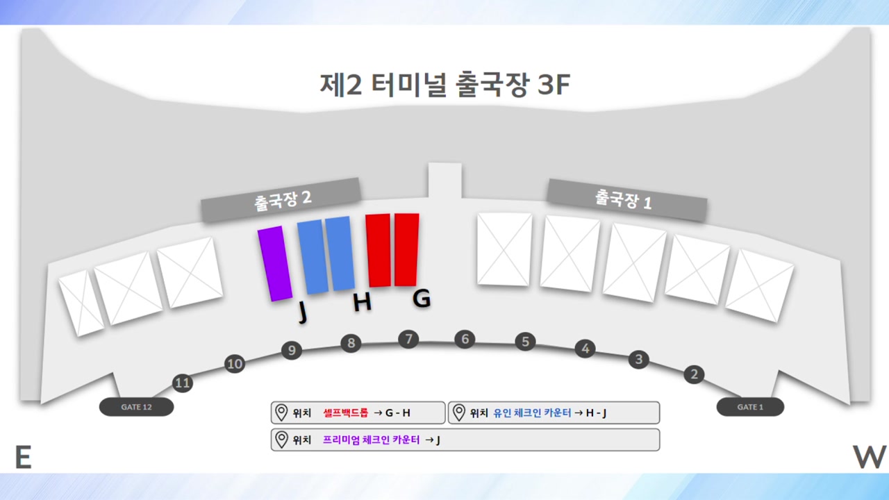 탑승 수속은 2 터미널 G∼J 카운터에서 이뤄지며, 이 가운데 J 카운터는 비즈니스 클래스와 우수회원 전용 카운터로 운영됩니다.