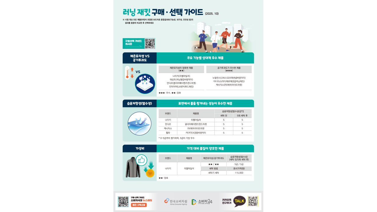 뉴발란스와 데상트, 아디다스와 언더아머의 제품의 발수성 등급이 하락했고, 나이키와 안다르, 젝시믹스와 휠라 등의 러닝 재킷은 세탁 뒤에도 5등급을 유지했습니다.