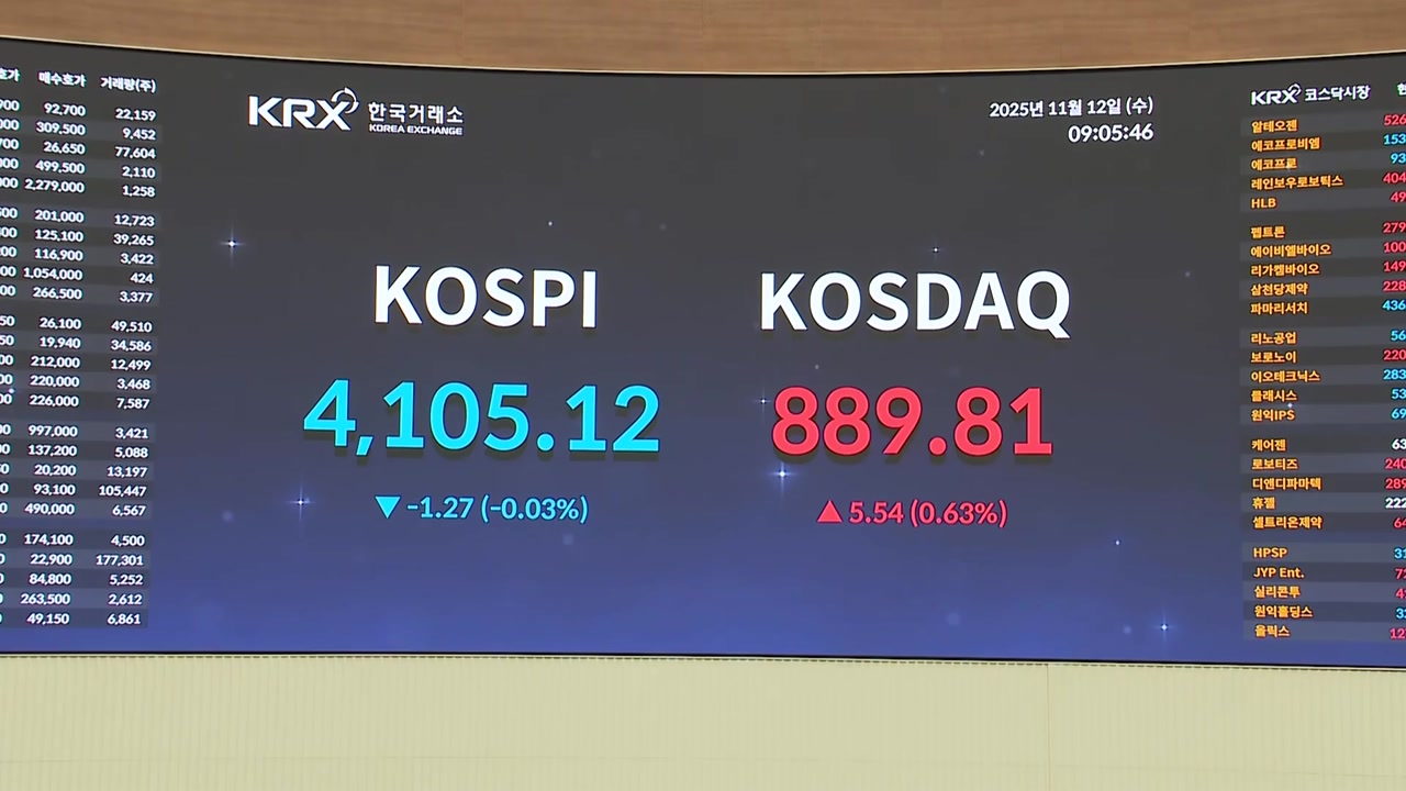 코스피는 0.2% 내린 4,097로 출발해 장 초반 4,100선 아래로 내려갔지만 다시 4,100선을 회복해 상승세를 이어가고 있습니다.