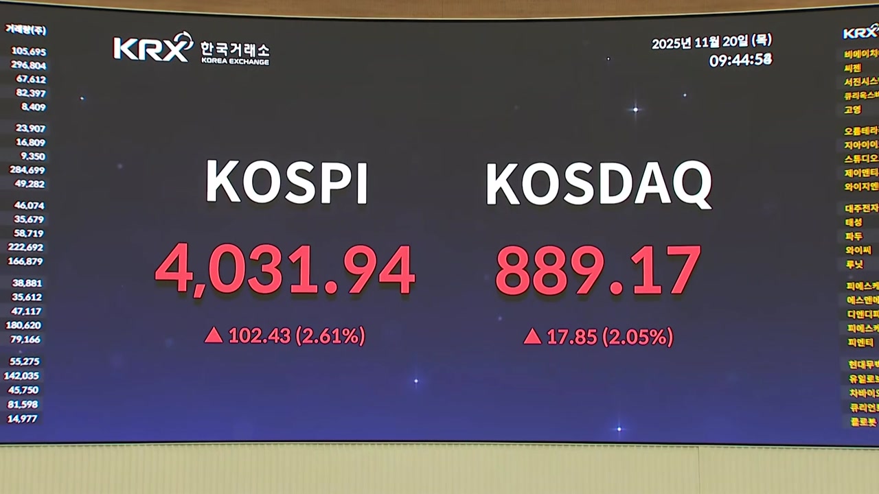 엔비디아가 AI 거품론을 딛고 3분기 사상 최대 실적을 발표한 영향으로 코스피가 2.5% 넘는 급등세를 보이며 4천 선을 회복했습니다.