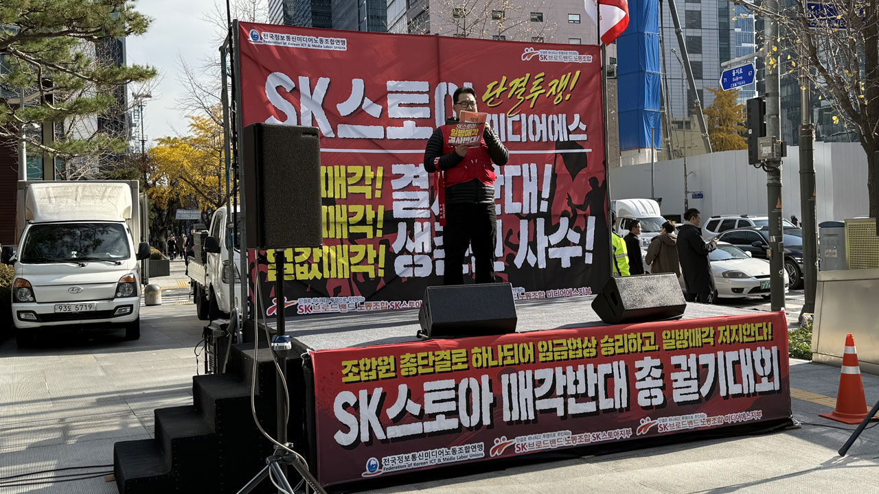 SK스토아 노조가 오늘 서울 중구 SK텔레콤 본사 앞에서 매각 반대 총궐기대회를 열었습니다.