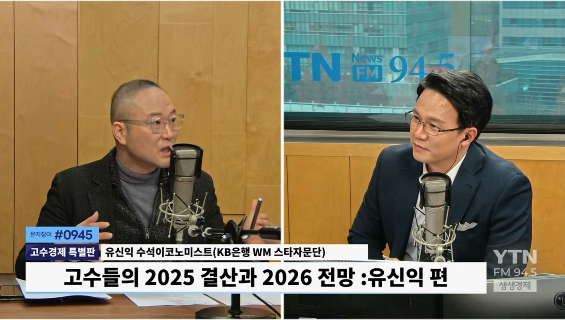 ◆ 조태현 : 2025년 이제 시작이네라고 생각을 했는데 벌써 끝날 때가 다 됐습니다. 다음 주면 올해 마지막 달 12월이 됩니다. 지난해 12월 비상계엄 이후에 혼돈 속에 시작한 2025년이 저물고 있는 건데요. 경제 전반에도 상당히 많은 변화가 있었습니다. 특히 올해 초에 2400선으로 출발했던 코스피 지금은 4천선을 돌파하기도 했고요. 약간 조정을 받았습니다만 연초와 비교하면 굉장히 많이 오른 것은 부정할 수 없는 사실인 것 같습니다. 그래서 오늘은 지난 한 해를 정리하고요. 다가오는 새해에 전망도 해보는 시간 마련했습니다. 2025 결산과 2026 전망 <고수경제> 특별판입니다. 오늘은 첫 번째 순서로 증시 결산 전망 한번 해보도록 하겠습니다. KB WM 스타자문단의 유신익 수석 이코노미스트와 함께하겠습니다. 박사님, 어서 오십시오.