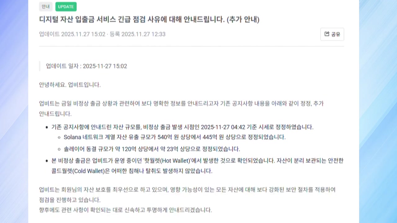 운영사 두나무 오경석 대표는 어제(27일) 새벽 4시 42분쯤 솔라나 네트워크 계열 자산 일부가 내부에서 지정하지 않은 지갑으로 전송된 정황을 확인했다고 밝혔습니다.