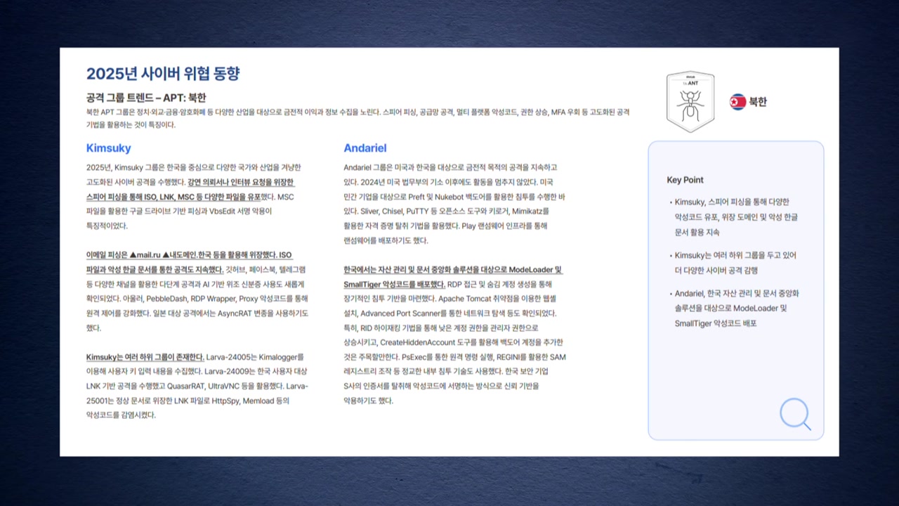 또 북한이 가상자산 탈취에 특화된 악성코드를 개발하고 있으며 한국은 디지털 의존도가 높아 집중 공격 대상이 될 가능성이 높다고 설명했습니다.