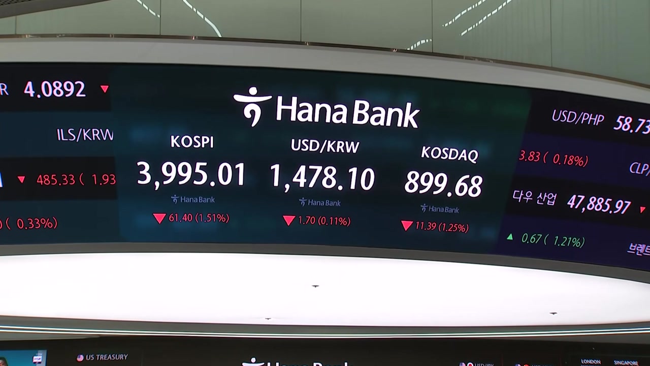 코스피는 개장 직후 1.7% 급락하며 3,989.6으로 출발했습니다.