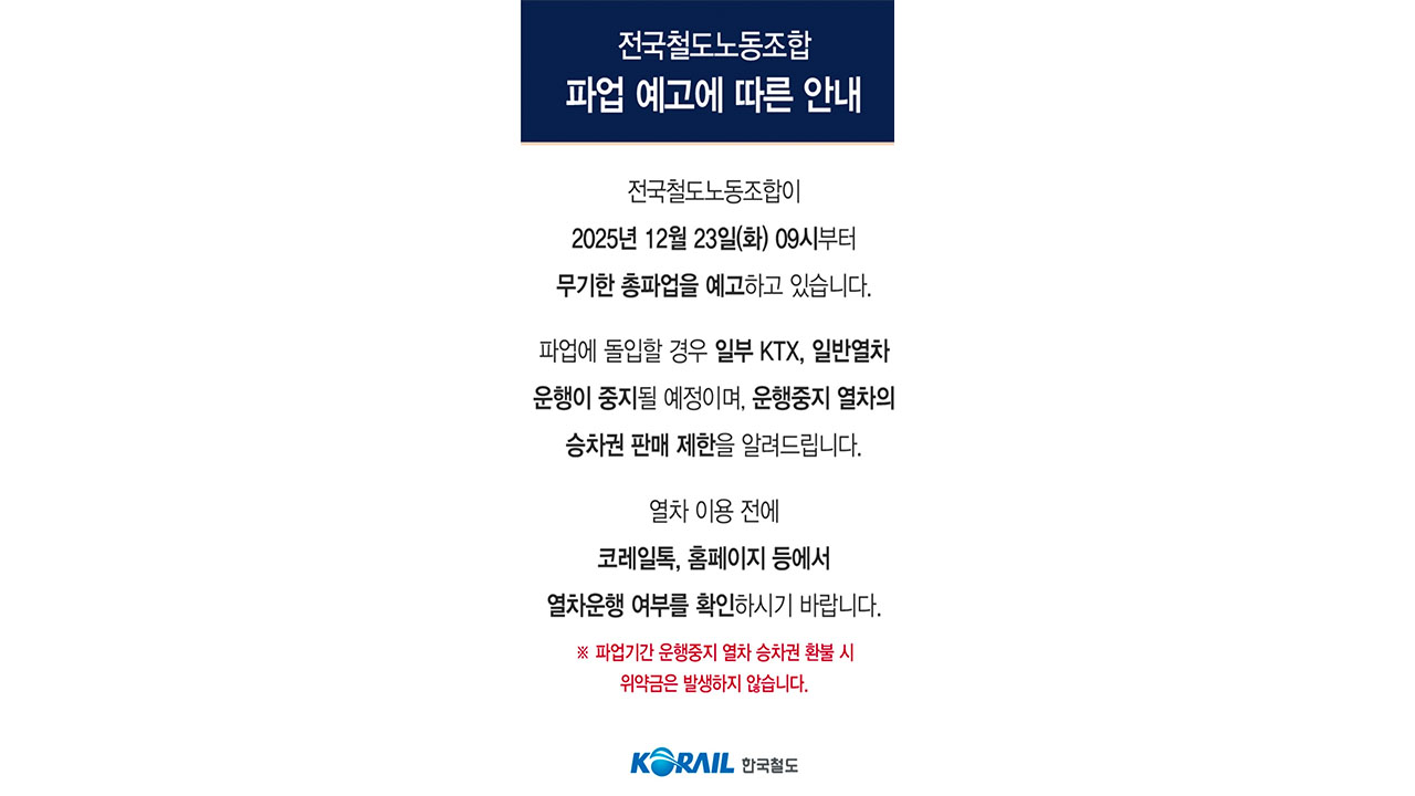 코레일은 철도노조가 파업할 경우 하루 평균 250여 대의 열차 운행이 중지될 것으로 보고, 23일부터 29일 사이 운휴 가능 열차의 승차권 발매를 선제적으로 제한한다고 밝혔습니다.