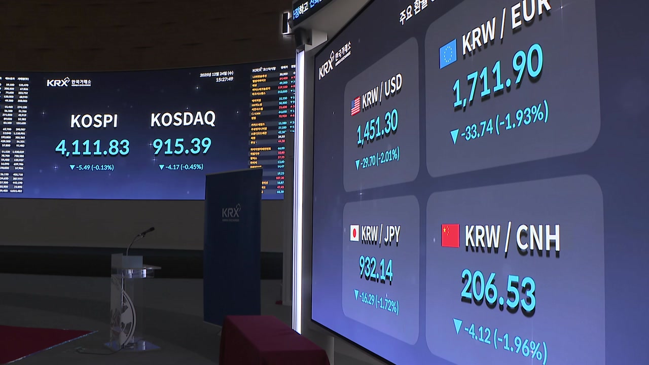 환율이 안정세를 찾았지만 코스피는 개인의 순매도로 0.2% 내린 4,108로 마감해 사흘간의 '산타랠리'를 끝냈습니다.