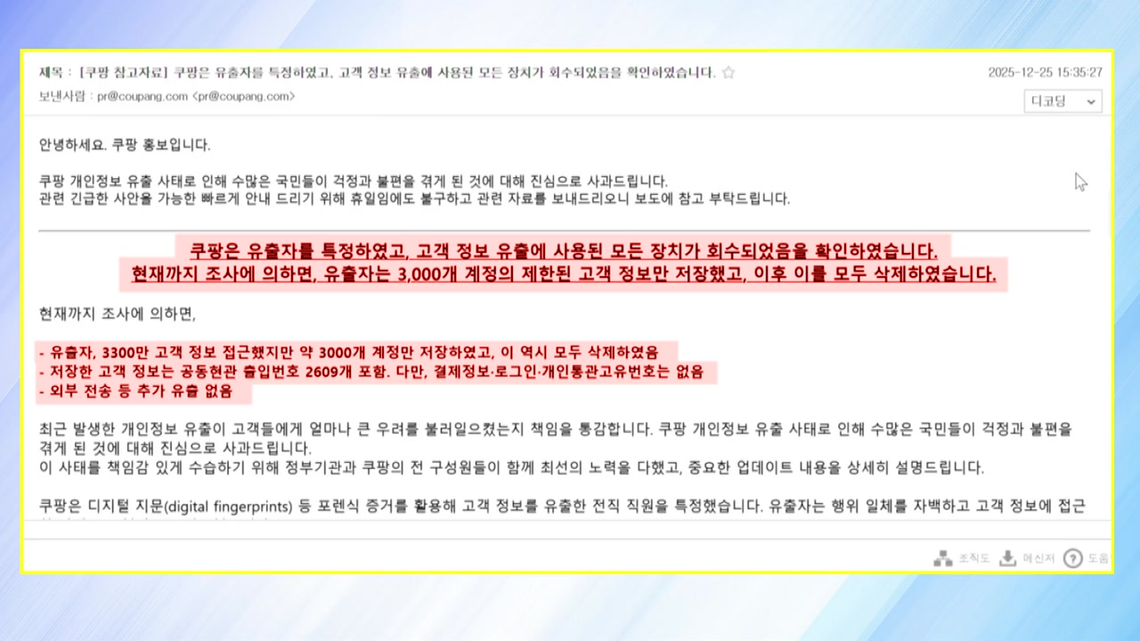 앞서 과기정통부는 "조사 중인 사항을 쿠팡이 일방적으로 알린 데 대해 강력히 항의했다"고 밝히며 쿠팡이 주장하는 내용은 확인되지 않았다고 못 박았습니다.