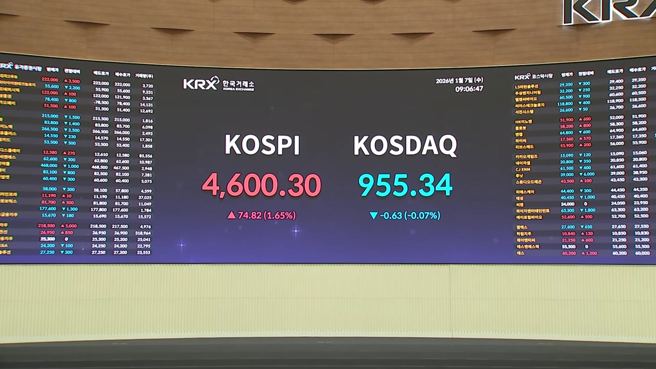 코스피가 반도체 대형주들의 계속된 강세에 힘입어 사흘 연속 신고가를 갈아치우고 있습니다. 어제는 사상 처음으로 4,500선까지 돌파했는데요. 오늘도 상승 흐름을 이어갈 수 있을지 개장 화면을 보겠습니다. 현 시점 코스피와 코스닥 색깔이 다릅니다. 코스피가 0. 9% 오른 4566포인트로 개장했는데요. 상승폭을 키워가고 있습니다. 현재 4593포인트, 곧 4600포인트를 앞두고 있는 상황입니다. 계속 올라가고 있는데요. 지금은 4594포인트를 지나가고 있습니다. 그리고 코스닥도 보겠습니다. 코스닥은 0. 19% 오른 957포인트로 출발했지만 이내 하락 전환했습니다. 954포인트를 지나가고 있는 상황입니다. 최근 계속해서 반도체 대형주들이 강세를 보이고 있는데. 지금 코스피가 4600포인트를 넘었습니다. 삼성전자와 SK하이닉스가 급등하면서 지수를 끌어올린 것으로 해석이 되는데요. 삼성전자는 14만 원을 훌쩍 넘었고 그리고 SK하이닉스 역시 76만 원에 가까워진 상황입니다. 다시 전해 드리겠습니다. 현재 코스피가 4600포인트를 돌파했습니다. 그리고 코스닥은 여전히 하락 출발하고 있는 모습입니다. 원달러 환율도 잠깐 짚어보겠습니다. 새해 들어서 계속 상승세를 유지하고 있는데 1450원 수준까지 올라왔습니다. 오늘도 3원 오른 1448. 5원에 개장했습니다. 자세한 개장 상황은 이어지는 뉴스에서 전해 드리겠습니다.