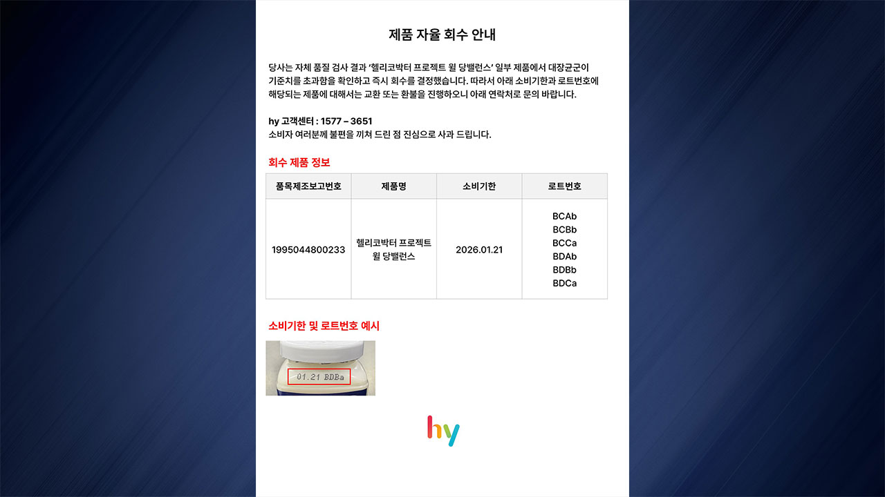 hy가 ’헬리코박터 프로젝트 윌 당밸런스’ 제품 회수에 나섰습니다.