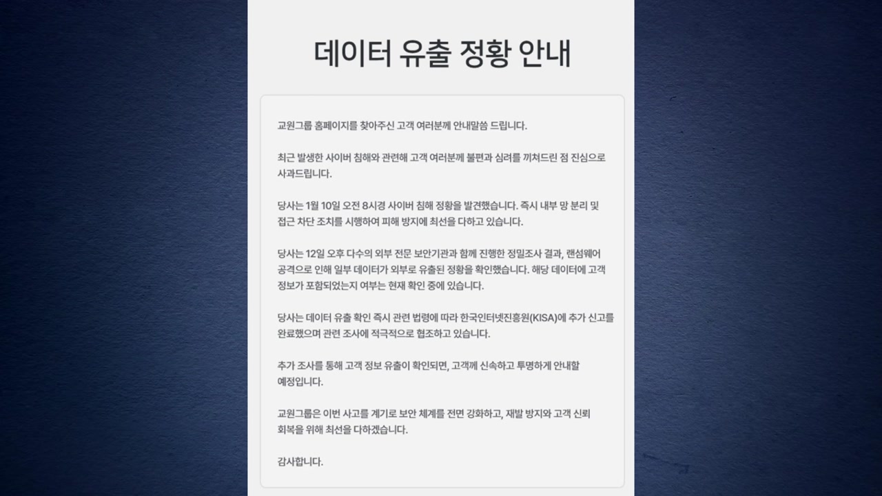 교원그룹은 지난 10일 오전 사내 시스템에서 이상 징후를 확인한 뒤 한국인터넷진흥원과 수사기관, 개인정보보호위원회에 침해 정황과 데이터 유출 가능성을 신고했으며 고객들에게도 문자와 알림톡으로 상황을 알리고 있다고 밝혔습니다.
