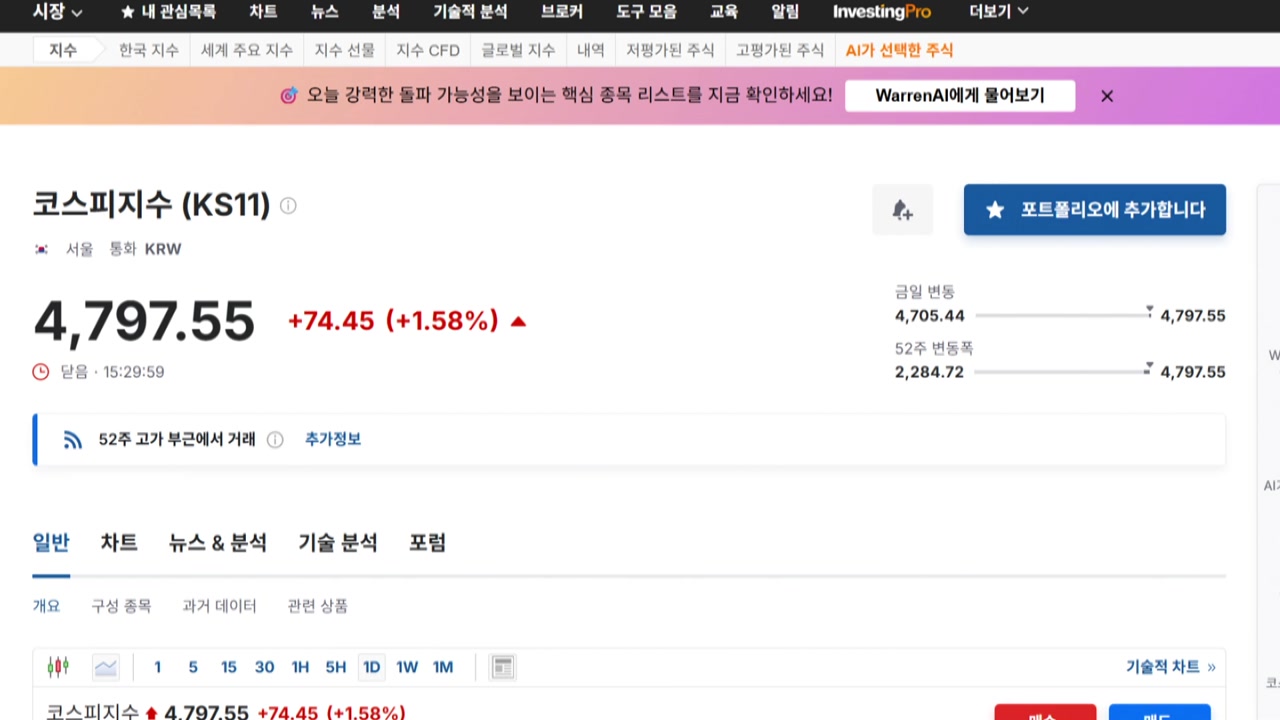 코스피는 0.3% 내린 4,710으로 출발했지만 기관과 외국인의 동반 순매수에 힘입어 1.6% 오른 4,797 사상 최고치로 장을 마쳤습니다.
