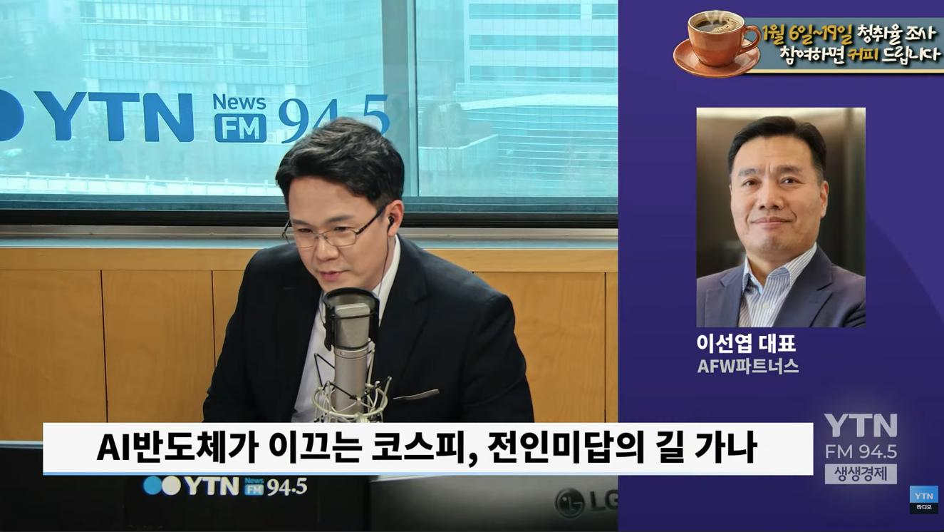 ◇조태현: 오늘 새벽에 마감된 뉴욕 증시는 타이완의 반도체 업체 TSMC의 어닝 서프라이즈 소식에 힘입어서 오름세로 마감을 했습니다. 우리 코스피는 어제 10거래일 연속 상승하면서 다시 최고 사상 최고치를 경신을 했고요. 오늘도 일단 장 초반에는 약간 오르고 있다가, 오름 폭이 줄어드는 그런 분위기로 시작을 했습니다. 글로벌 증시나 우리 국내 증시를 봐도 온통 인공지능, 그리고 반도체 관련 이야기로 도배가 되고 있습니다. 지금까지 보지 못한 시장이 도래한 걸까요? <2026 경제 전망 AI 대전환 시리즈> 그 네 번째입니다. 오늘은 AI 반도체가 이끄는 증시 이야기를 해보도록 하겠습니다. AFW파트너스의 이선엽 대표와 함께 하겠습니다. 대표님 나와 계십니까?