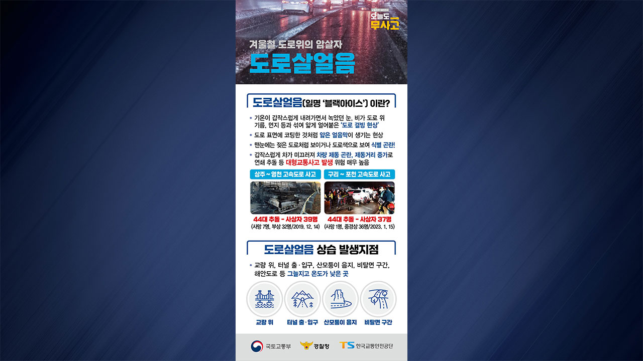 공단은 겨울철 눈이나 비가 온 뒤 특히 다리 위와 터널 출입구, 산모퉁이 음지 등 그늘지고 온도가 낮은 곳에서 도로가 얼어붙는 일이 잦다며 서행운전 등 주의를 당부했습니다.