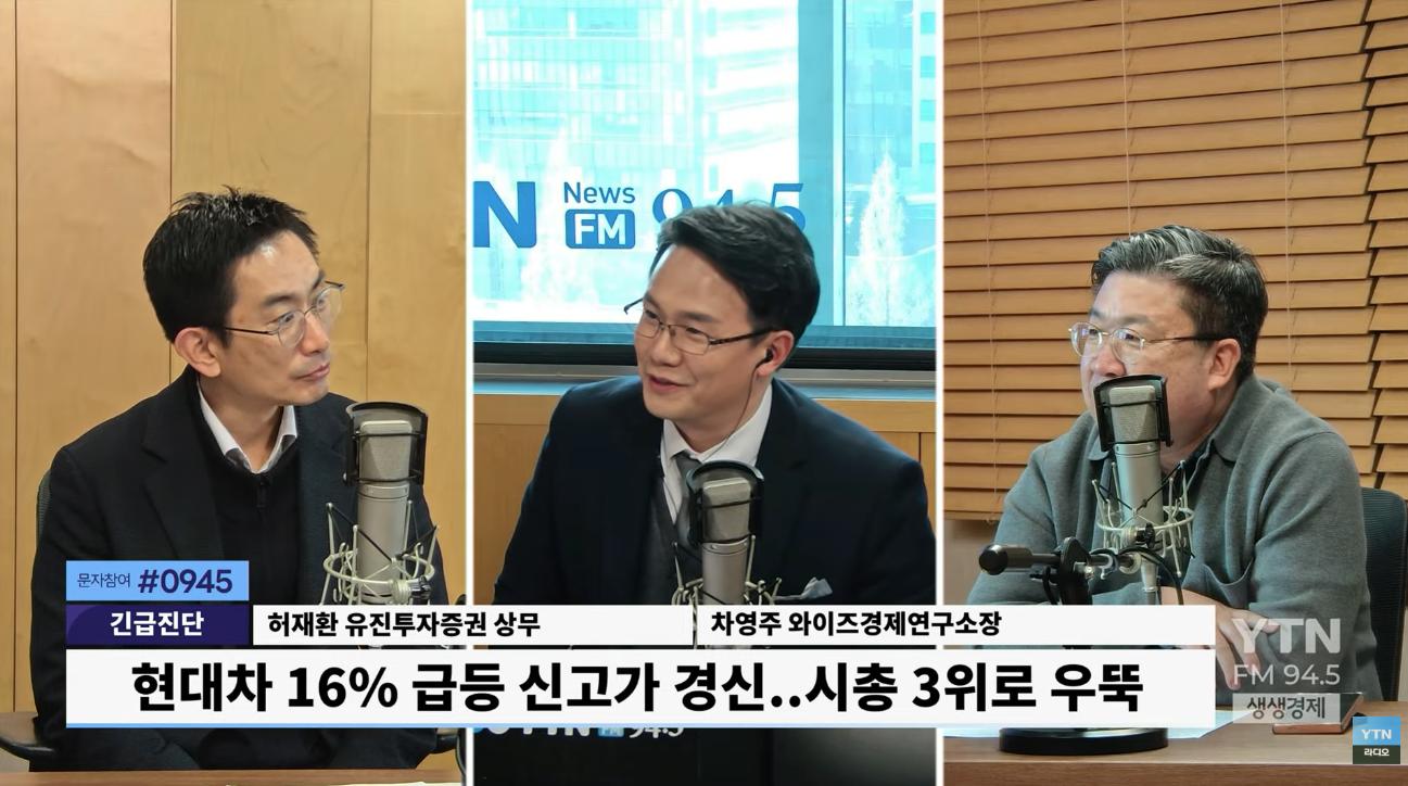 ◎허재환: 단순히 순환은 아닌 것 같아요. 그러니까 현대차, 그리고 자동차 같은 경우가 사실 저희 국내 대형주들 중에 엄청 저평가되어 있는 종목이었잖아요? 작년 말만 해도 현대차 같은 경우에 PER(주가 수익 비율) 5배, 6배 이렇게 밖에 안 됐던 건데, 사실 작년 말부터 자동차 수출이 약간은 바닥을 치고 올라오는 모습들이 보였기 때문에, 올해는 관세에 대한 걱정들. 이런 것들에서 좀 벗어나서 작년보다는 실적이 좀 좋아질 수 있는 상황인데, 여기에다가 '로봇 ‘피지컬 AI'라는 옷을 새롭게 입지 않았나 라는 생각이 좀 들어요. 그러니까 물론 어저께 엄청 막 10%씩 급등하는 건 조금 오버라는 생각이 들긴 하는데, 왜냐하면 현대차 같이 무거운 주식이 너무 올라가니까 "야 이건 뭔가?"라는 생각이 좀 들긴 했지만, 어쨌든 저희 국내 경제에서도 그렇고, 반도체 이외에 다른 산업이 사실 안 보인다라는 게 저희 국내 주식시장이나 경제에 있어서도 굉장히 좀 큰 고민이었는데, 이거를 '피지컬 AI'라는 로봇이라는 그런 것들로 인해서 새로운 어떤 성장에 대한 기대감을 얻게 되었다 라는 거는 분명히 좀 고무적이고. 그러니까 이게 실적 플러스 약간 '리레이팅' 개념으로 이렇게 진행이 된 거다 보니까, 사실 굉장히 새로웠던 것 같기는 합니다. 근데 문제는, 조금 그래도 어제는 과했다 라는 생각이 드는 거죠.