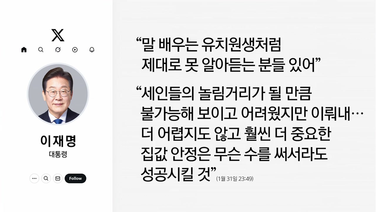 부동산 시장을 잡겠다는 의지를 거듭 강조하고 있는 이재명 대통령이, 주말에도 밤낮을 가리지 않고 SNS에 글을 쏟아냈습니다. 집값 안정에 반드시 성공하겠다며, 야당의 반박과 언론의 우려를 강하게 비판하기도 했습니다. 서은숙 상명대 경제금융학부 교수와 알아보겠습니다.