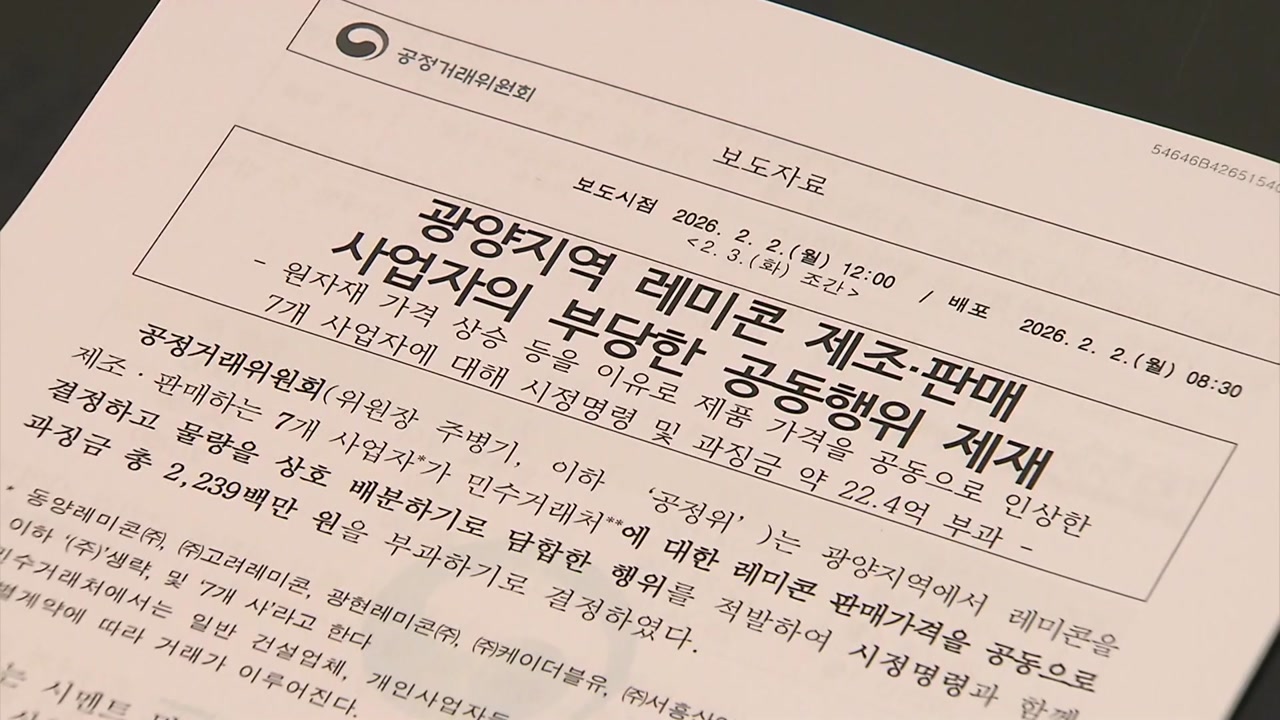공정위는 케이더블유와 고려레미콘 등 광양지역 레미콘사업자들이 원·부자재 가격 상승으로 경영 상황이 악화되자 건설사 등 민수거래사에 대한 판매가격을 함께 결정하고 물량을 상호 배분하기로 짬짜미했다고 밝혔습니다.