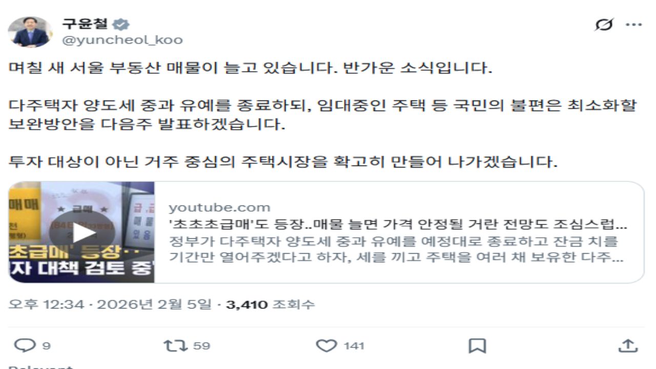 구윤철 부총리 겸 재정경제부 장관은 오늘 소셜미디어에 다주택자 양도세 중과 유예를 종료하되 임대 중인 주택 등 국민의 불편을 최소화할 보완 방안을 다음 주 발표하겠다고 밝혔습니다.