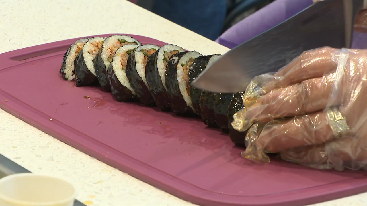 앞치마를 두른 외국인 관광객들이 조심스럽게 비빔밥과 김밥을 만듭니다.