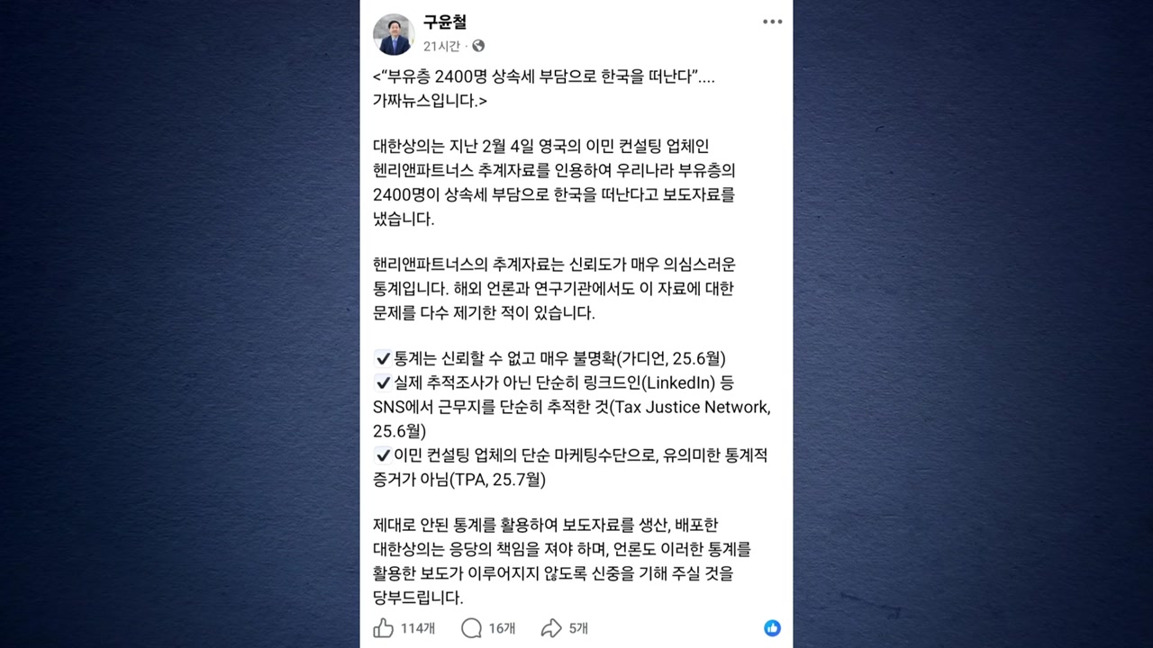 구윤철 부총리 겸 재정경제부 장관이 부유층 2,400명이 상속세 부담으로 한국을 떠난다는 것은 가짜뉴스라고 지적했습니다.