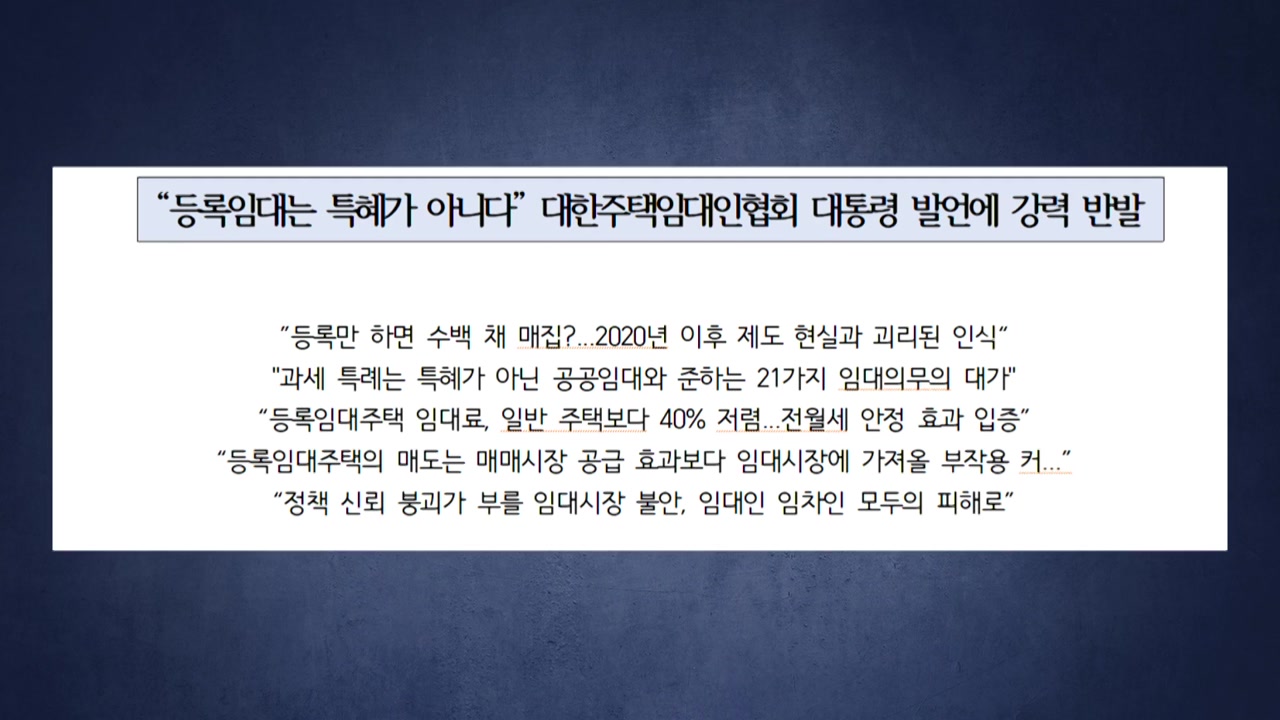 대한주택임대인협회는 오늘(10일) 배포한 입장문에서 대통령 발언처럼 임대사업자 등록만으로 주택을 무제한 매집할 수 있다는 주장은 명백한 사실오인이라고 지적했습니다.