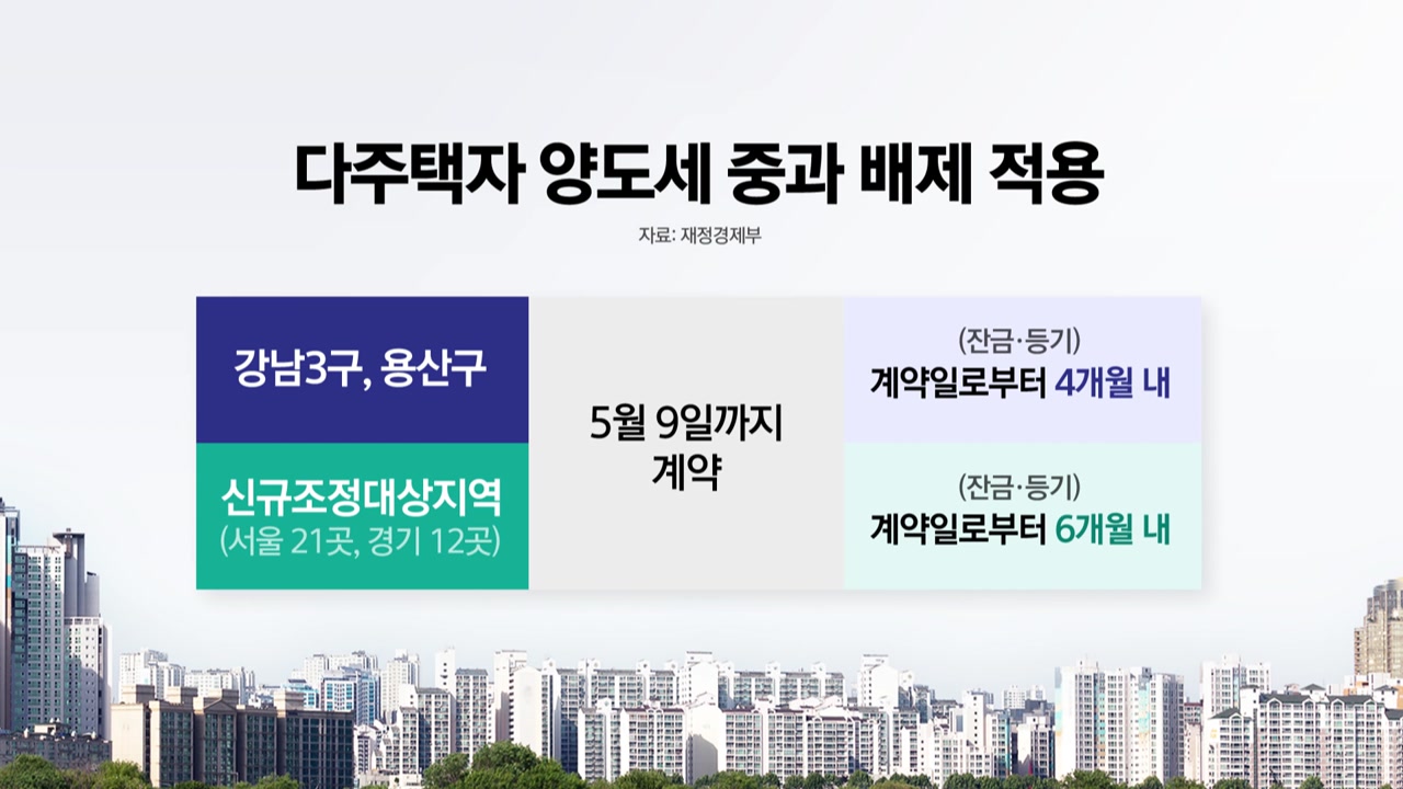 [조만희 / 재정경제부 세제실장 : 5월 9일까지 매매계약을 완료한 경우에는 조정대상지역 지정 시점과 임대차 계약 상황에 따라 양도소득세 중과의 적용과 토지거래허가제도상 실거주 의무를 일정 기간 유예합니다.]