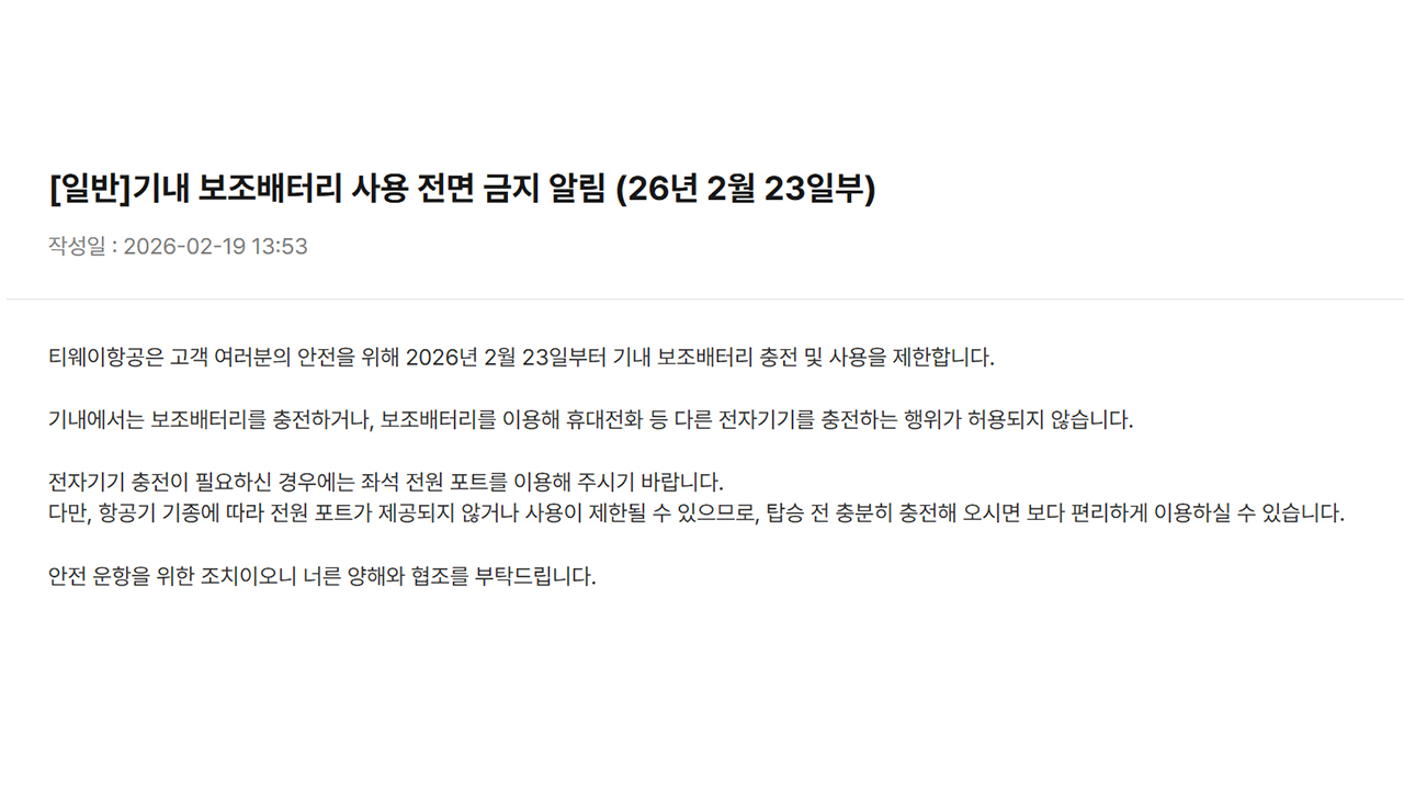![[기업] 티웨이항공 "23일부터 기내 보조배터리 사용 금지"](https://image.ytn.co.kr/general/jpg/2026/0220/202602201434416465_t.jpg)