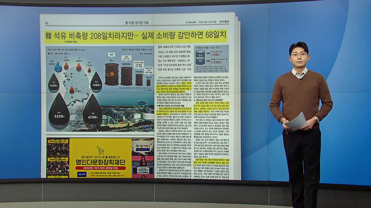 먼저 동아일보는 우리나라의 석유 비축량을분석했습니다. 국제에너지기구 기준으론 208일치인데, 실제 소비량을 감안하면 68일치라고 하네요. 우리 정부는 총 9개 기지에 나눠 1억 배럴의 비축유를 저장하고 있습니다. 민간이 보유한 9천만 배럴을 더하면 1억 9천만 배럴을 확보하고 있고요. 여기에 우선 구매권을 쓸 수 있는 산유국 공동 비축 물량과 아랍에미리트 도입분을 합치면 총 2억1,600만 배럴입니다. 국제에너지기구에 따르면 한국의 비축 규모는 세계 6위로, 수입 없이 208일을 버틸 수 있는 수준입니다. 그런데 이건 수출 고려 없이 내수 소비만 가정한 계산입니다. 한국의 하루 석유 소비량은 약 280만 배럴인데요. 평상시처럼 석유제품 수출을 중단하지 않는다고 가정해 계산하면 68일 수준인 겁니다. 석유 수급에 대한 우려가 커지자 정부는 이르면 이번 주 석유 최고가격제를 시행할 계획입니다. 국내에 보관 중인 해외 정유사 물량을 우선 매수하는 방안도 검토 중인데요. 중동 중심의 원유 수입 구조를 다변화해야한다는 목소리도 나옵니다.