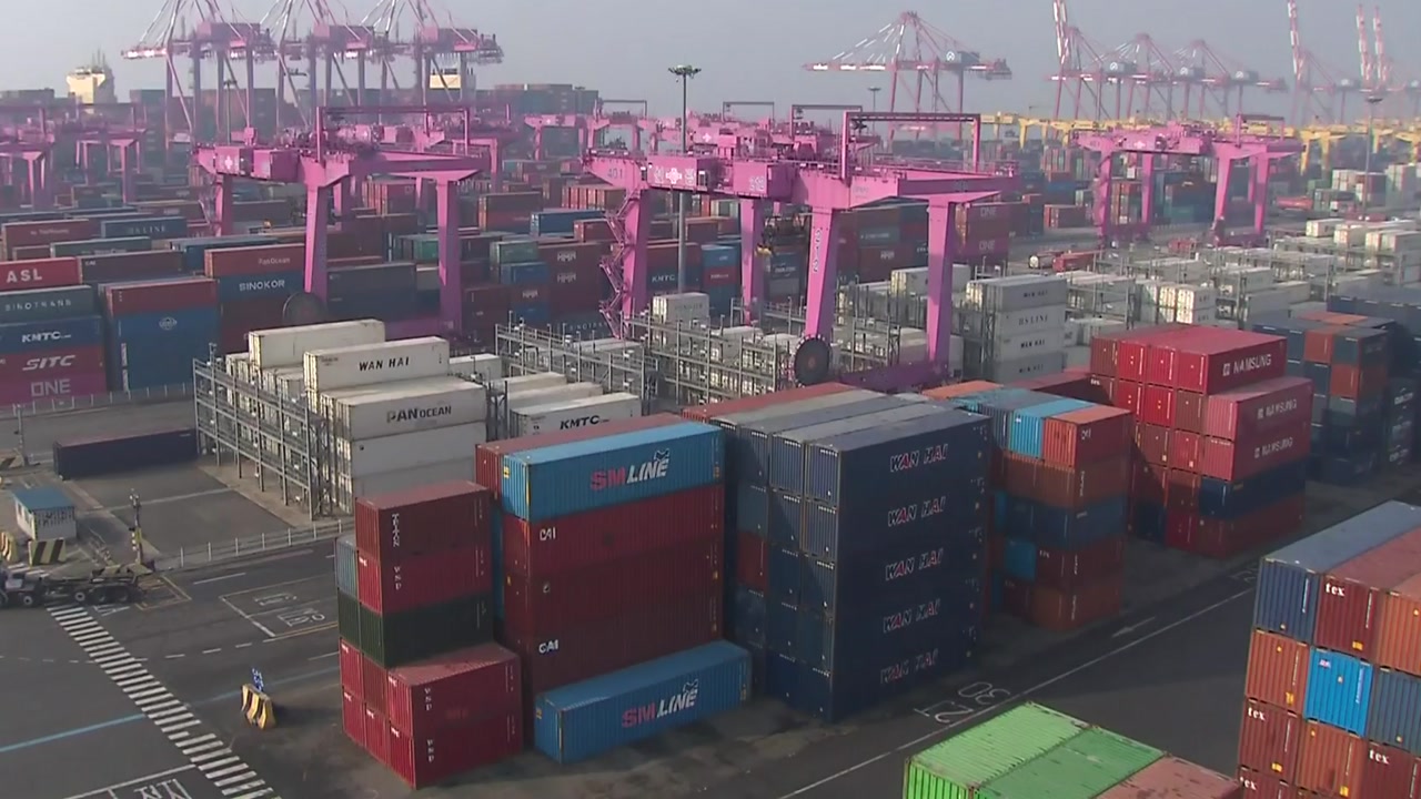 네, 제가 나와 있는 인천 신항 터미널에는 수출품을 실은 컨테이너들이 빼곡히 쌓여있습니다.